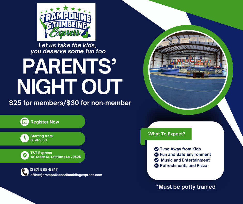 Parent’s Night out is held on specified Friday evenings from 6:30-9:30pm and is open to children ages 5 and up of all levels who want to participate. Drop the kids off for a night of fun which includes supervised free time jumping and playing games. Pizza and a drink is included in the price for each participant.